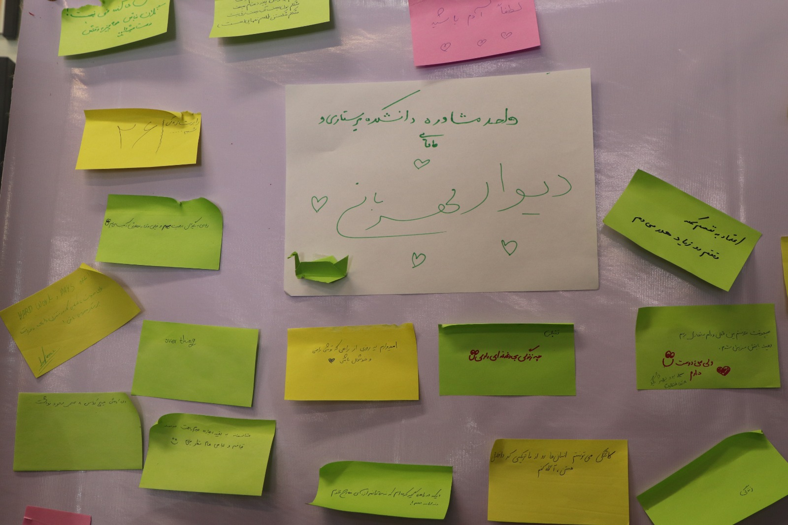 در این طرح که به مناسب هفته سلامت روان برگزار شد ، دانشجویان فضایی متفاوت و نشاطآمیزی را برای خود رقم زدند که طی آن هر کدام از دانشجویان به ابراز و بیان احساسات ، هیجانات ، امیدها ، اهداف ، دغدغه ها و ... خود به صورت نوشتار بر روی کاغذ پرداختند. دانشجویان در دو وضعیت نوشتاری در یکی از غرفهها، احساسات و رنجهای خود را روی کاغذهای یادداشت چسب دار نوشته و در غرفه ای دیگر برای رنجهای دیگر دانشجویان جملات همدلانه و دلگرمکننده نوشتند.