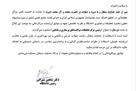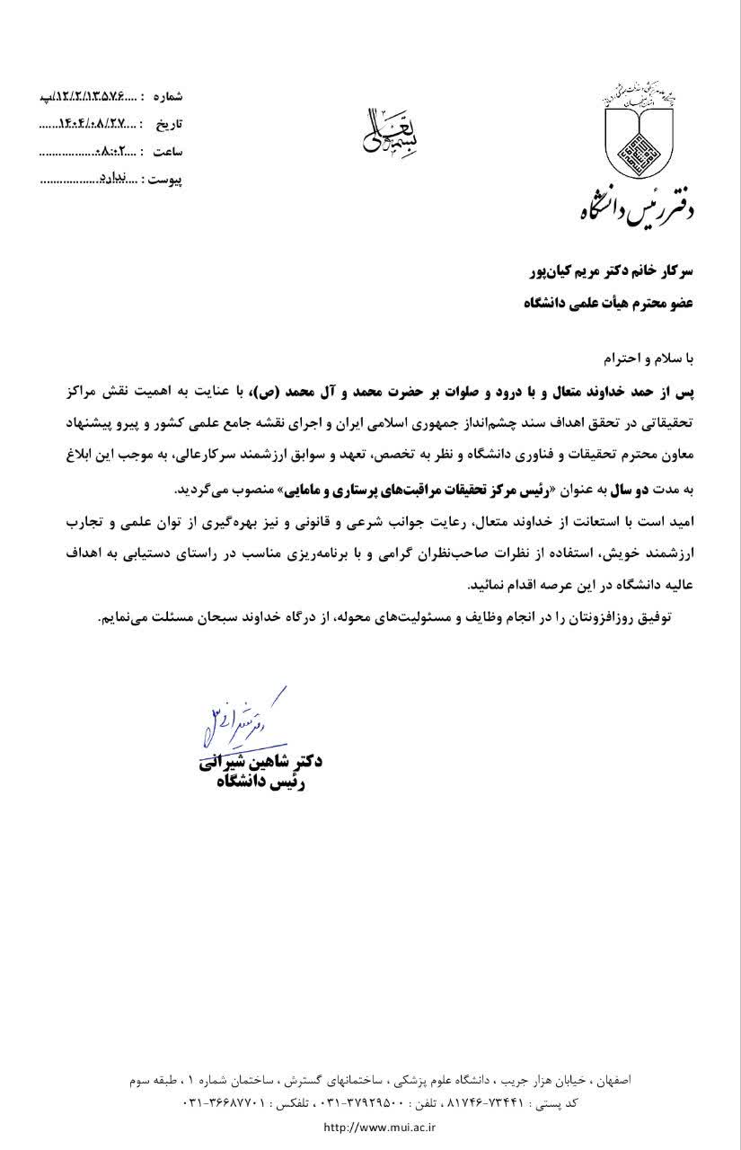 بدینوسیله انتصاب شایسته شما به عنوان(( رئیس مرکز تحقیقات مراقبتهای پرستاری و مامایی)) را صمیمانه تبریک عرض مینمایم.